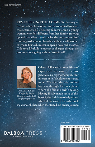 Remembering the Cosmic is the story of feeling isolated from others and disconnected from our true (cosmic) self. The story follows Chloe, a young woman who felt different from her family growing up and describes the obstacles she encounters after choosing to disconnect from her authentic self in order to try and fit in. She meets Imogen, a healer who teaches Chloe real life skills to practice as she goes through the process of realigning with her cosmic self.
